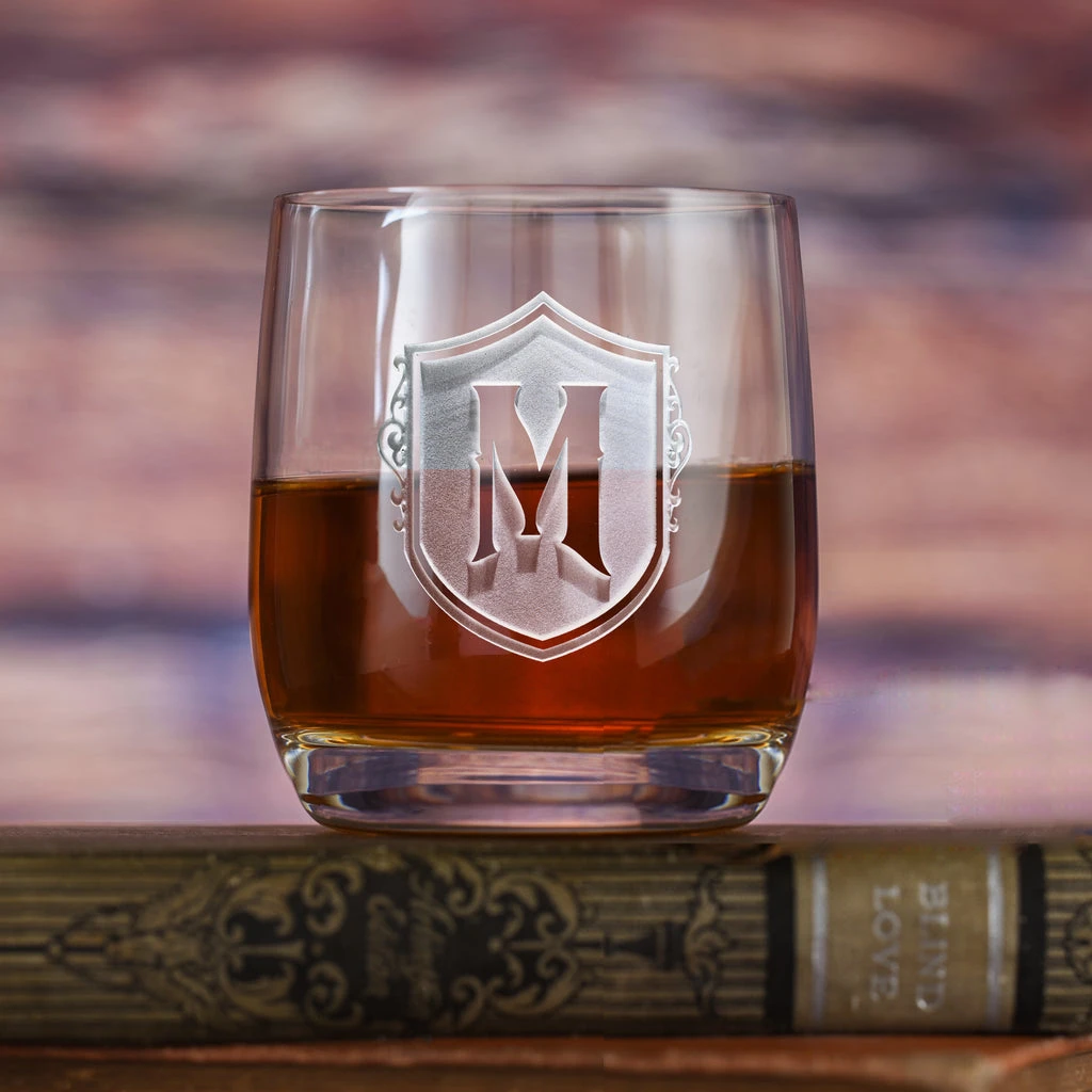 Crystal Imagery introduces the shield monogram Stolzle Weinland rocks whiskey glass. This 11 oz. DOF glass has a sleek, slightly curved silhouette providing a polished look that everyone will love making it the perfect gift for the person who has everything. Sparkling and crystal clear, it will showcase a variety of drinks and cocktails or whiskey on the rocks. No matter what you serve, this Stolzle Weinland glass will make it shine.
