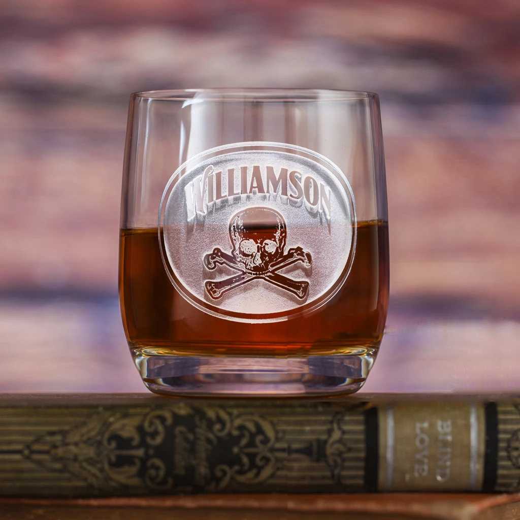 Crystal Imagery introduces the personalized engraved skull and bones Stolzle Weinland rocks whiskey glass. This 11 oz. DOF glass has a sleek, slightly curved silhouette providing a polished look that everyone will love making it the perfect gift for the person who has everything. Sparkling and crystal clear, it will showcase a variety of drinks and cocktails or whiskey on the rocks. No matter what you serve, this Stolzle Weinland glass will make it shine.