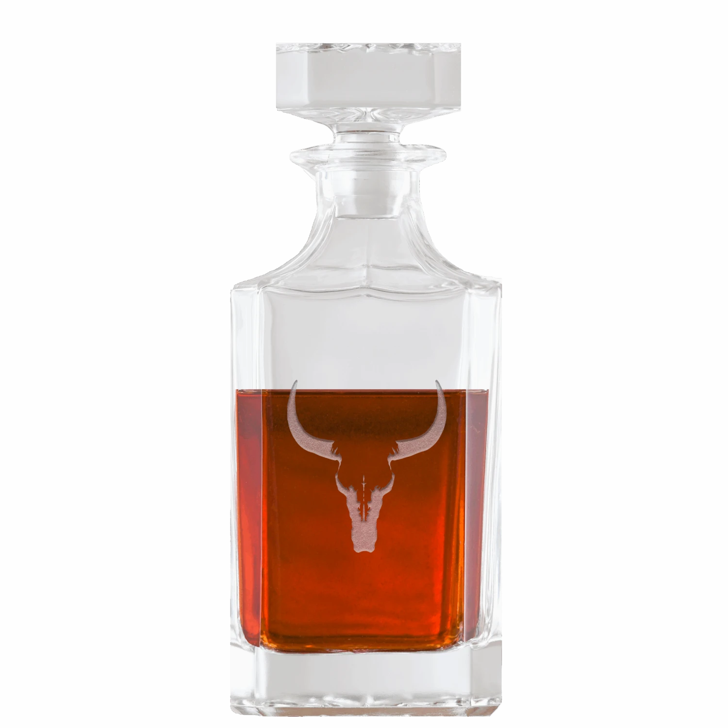 Custom engraved square whiskey decanter gift featuring Texas Longhorn Steer Skull, is deep etched making it a cool birthday, Christmas, wedding or anniversary gift for the bride and groom and men or women. Show him or her your love and appreciation with this cool longhorn steer skull design deeply engraved into a heavy weight high quality scotch, bourbon or whiskey decanter. Our deep carved custom whiskey longhorn decanter is a perfect custom etched gift that will be cherished for years to come. Our master carvers will deeply sand carve the background design into the glass, leaving your lettering and design raised from the glass surface in a stunning 3D manner that is unmatched by simple engraving, etching or screenprinting techniques. At 8.5″ high, our custom Texas longhorn steer skull decanter with logo holds 26 oz of your favorite spirit.