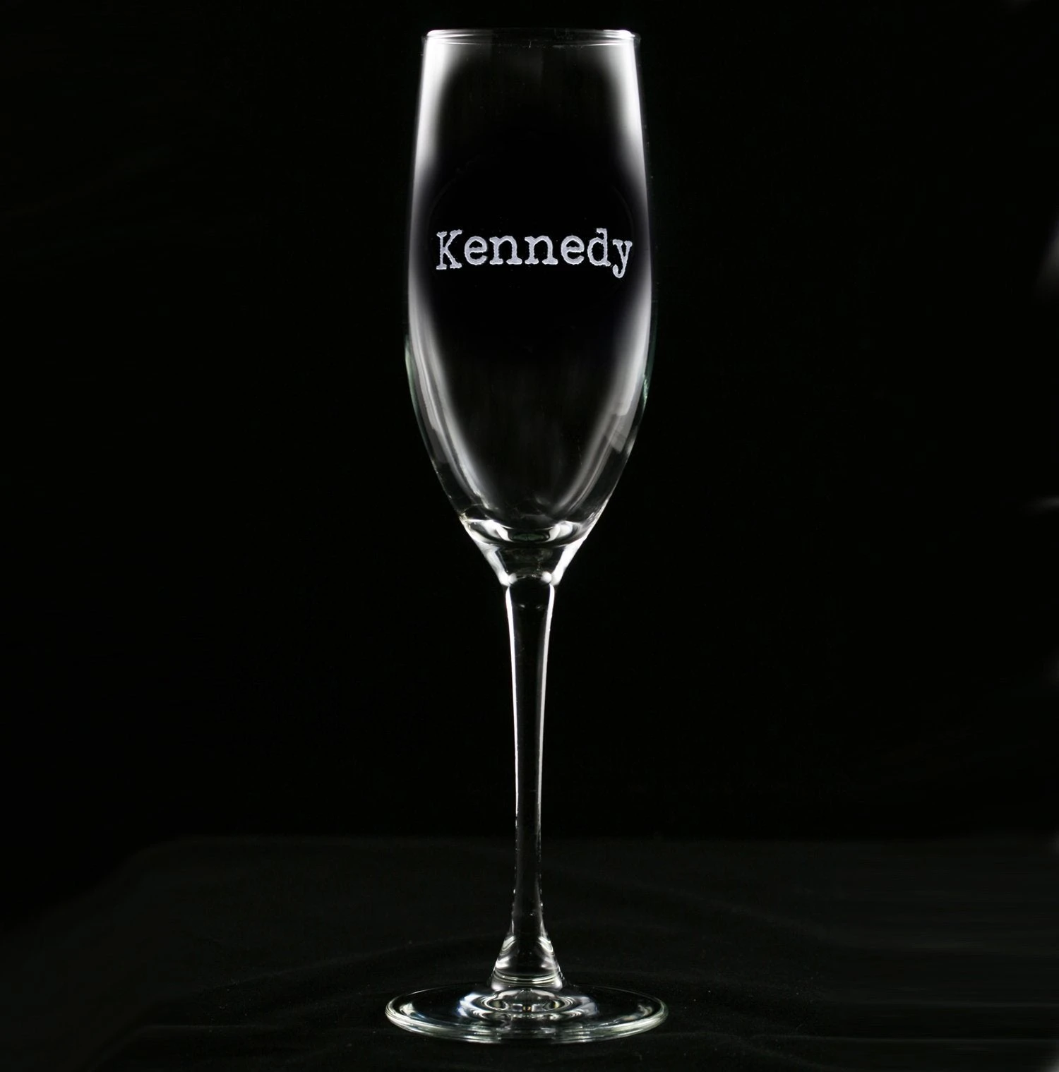Our personalized flute glasses feature the popular typewriter font. Our master glass carvers hand craft each engraving with your full first or last name or even favorite nickname- into each glass for a truly custom gift. These glasses are the perfect wedding gift, anniversary or birthday gift or even a great gift for your bridesmaids.