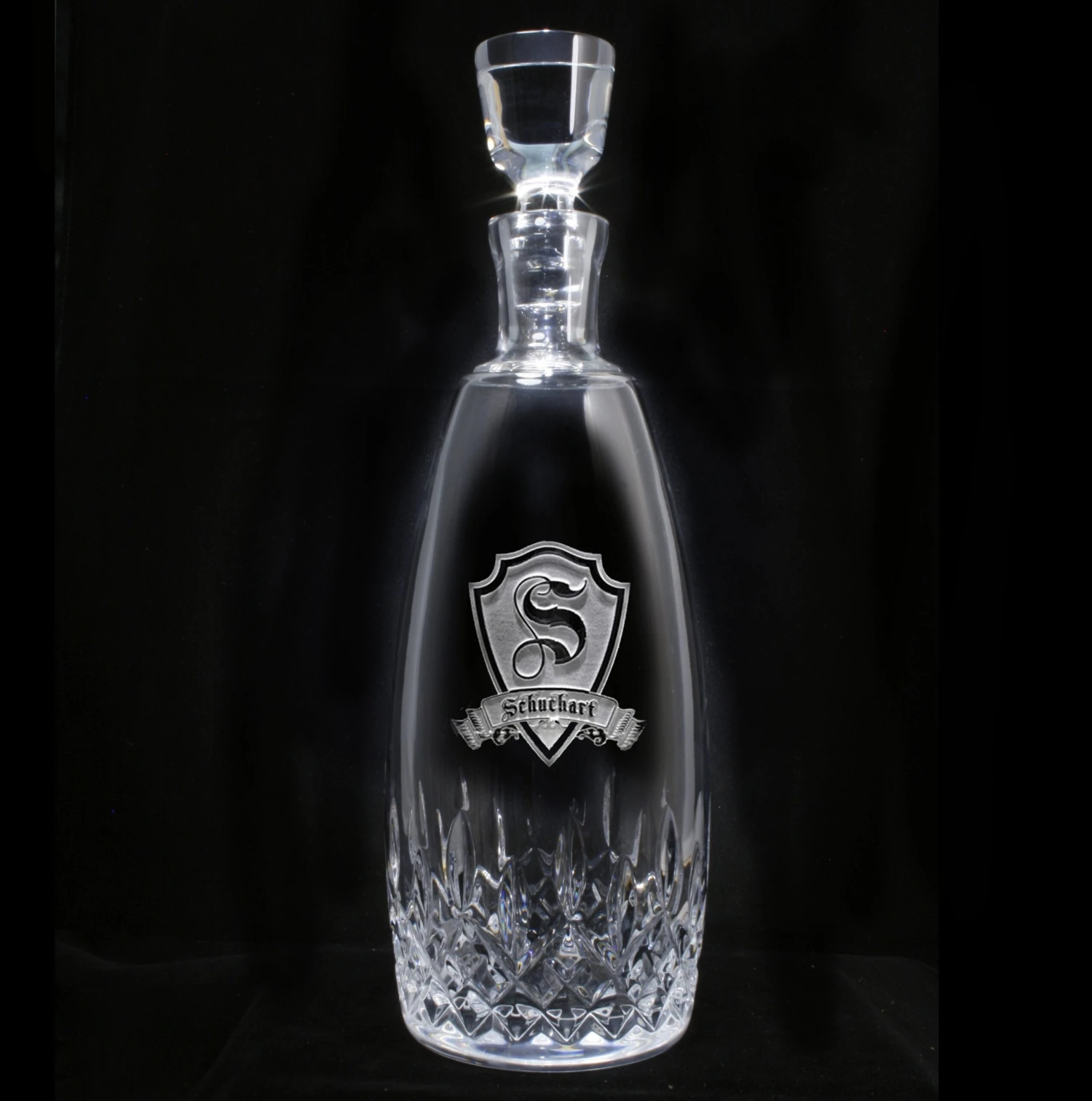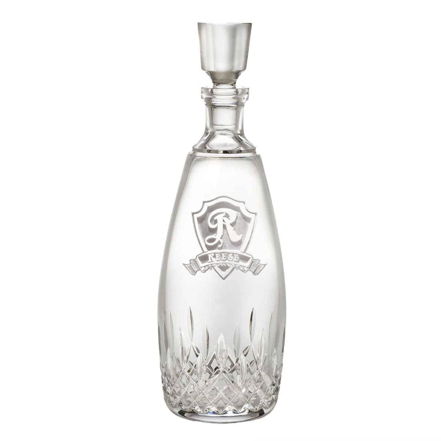 Waterford Crystal Lismore Essence Decanter with Stopper comes with Free Personalization making it a luxury gift idea for the bride and groom or anyone you want to truly impress! Great for displaying your favorite whiskey, scotch, bourbon, rye, moonshine brandy or even wine, this stunning crystal decanter with stopper makes the perfect cool gift for men and women for weddings, retirement, anniversary, birthday or any special occasion. Deeply carved using our sand carving technique, each Waterford Crystal Lismore Essence Decanter is meticulously custom carved to order by our master glass artisans making it the perfect gift for those seeking unique gift ideas for men and women alike. Our engraving technique doesn’t merely etch the surface like other glass engravers. Our process involves a five-step process resulting in a jaw-dropping 3D effect on your custom glassware and barware. Waterford Crystal Lismore Essence is the next generation of the classic Lismore pattern, retaining the brilliance and clarity of Lismore, while incorporating a more slender, modern profile. Add a new dimension to fine wines, brandy and eau de vie by decanting them into the cool, contemporary Lismore Essence Decanter with Stopper. Combining traditional decanter styling with a slimmer profile, the decanter highlights Lismore’s dramatic diamond and wedge cuts while retaining the comforting weight and stability you expect from Waterford’s hand-crafted, fine crystal. Waterford crystal barware item code 151746, Free Personalization, Free Engraving! Hand wash. Read detailed Waterford Crystal care instructions on our Customer Service page found at the bottom of each page on our site. Holds 36 oz. and measures 12 3/4′ high. WARNING: Consuming foods or beverages that have been kept or served in leaded crystal products or handling products of leaded crystal will expose you to lead, a chemical known to the State of California to cause birth defects or other reproductive harm.