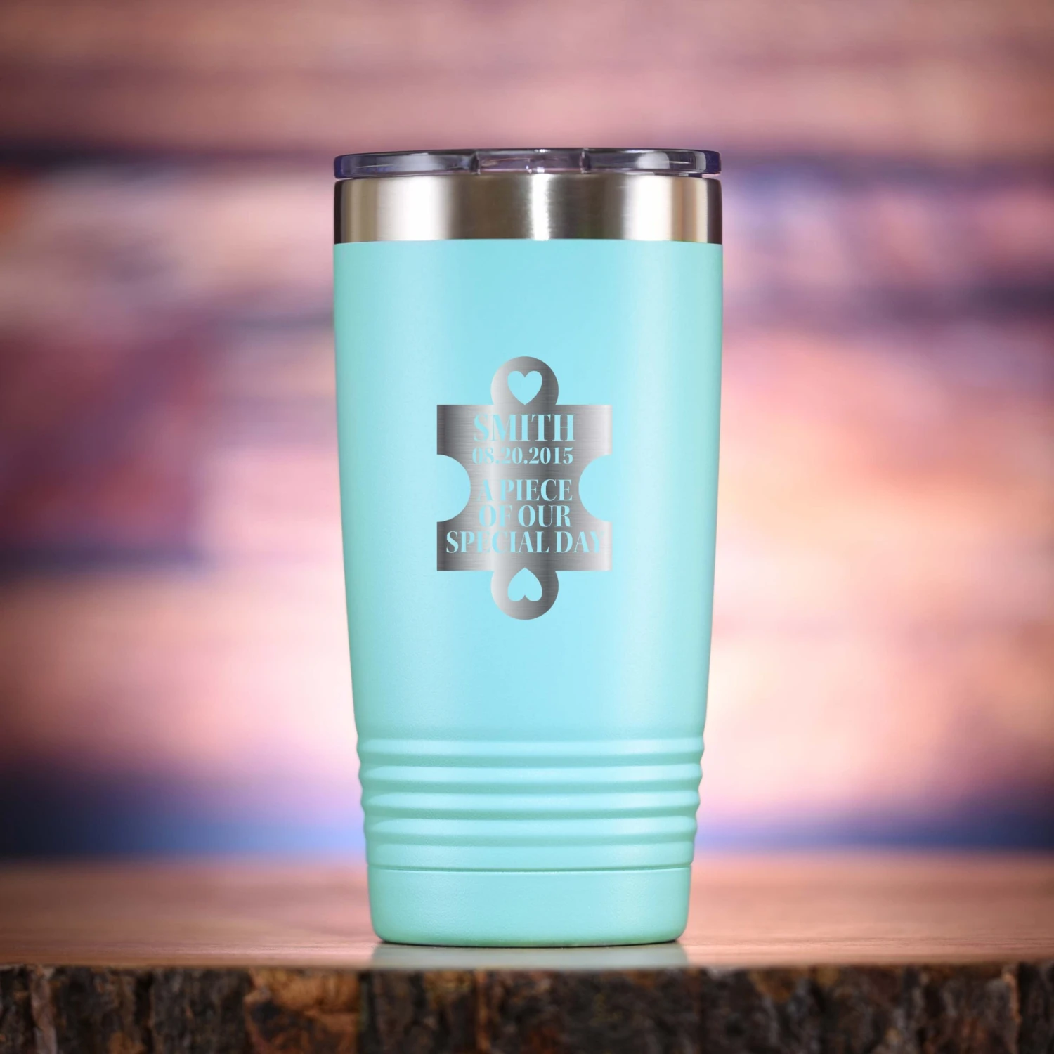 Wedding Day Puzzle Piece Travel Tumbler Favor is a cool gift for your bridal party and wedding day guests. “A Piece of Our Special Day” is featured on these sweet wedding favors. Featuring the bride and groom married name, wedding date and a puzzle piece design, this wedding favor is a gift your guests and attendants will enjoy for years to come. If you’re seeking the best favor gift for your wedding party, this travel tumbler is a great alternative to the typical wine glass, beer mug or money clip. Our puzzle piece mug/tumbler is perfect for hot coffee or cold beverages on the run and has a narrower bottom to fit most cup holders in your car, jeep, or truck. The opening in the lid is also big enough for a straw! We selected these Polar Camel 20 oz. ring neck vacuum insulated travel mugs for their high quality and durability. We laser etch our unique, funny and clever quotes and designs into the powder coated puzzle piece wedding favor, which creates the design in a sleek stainless steel finish.