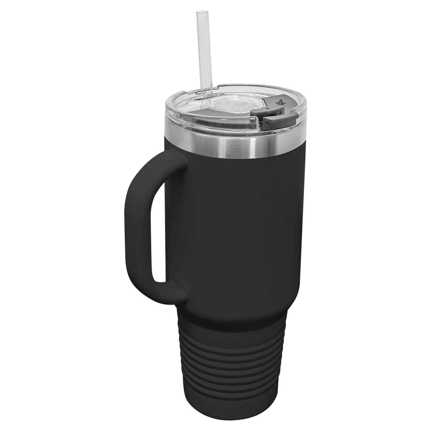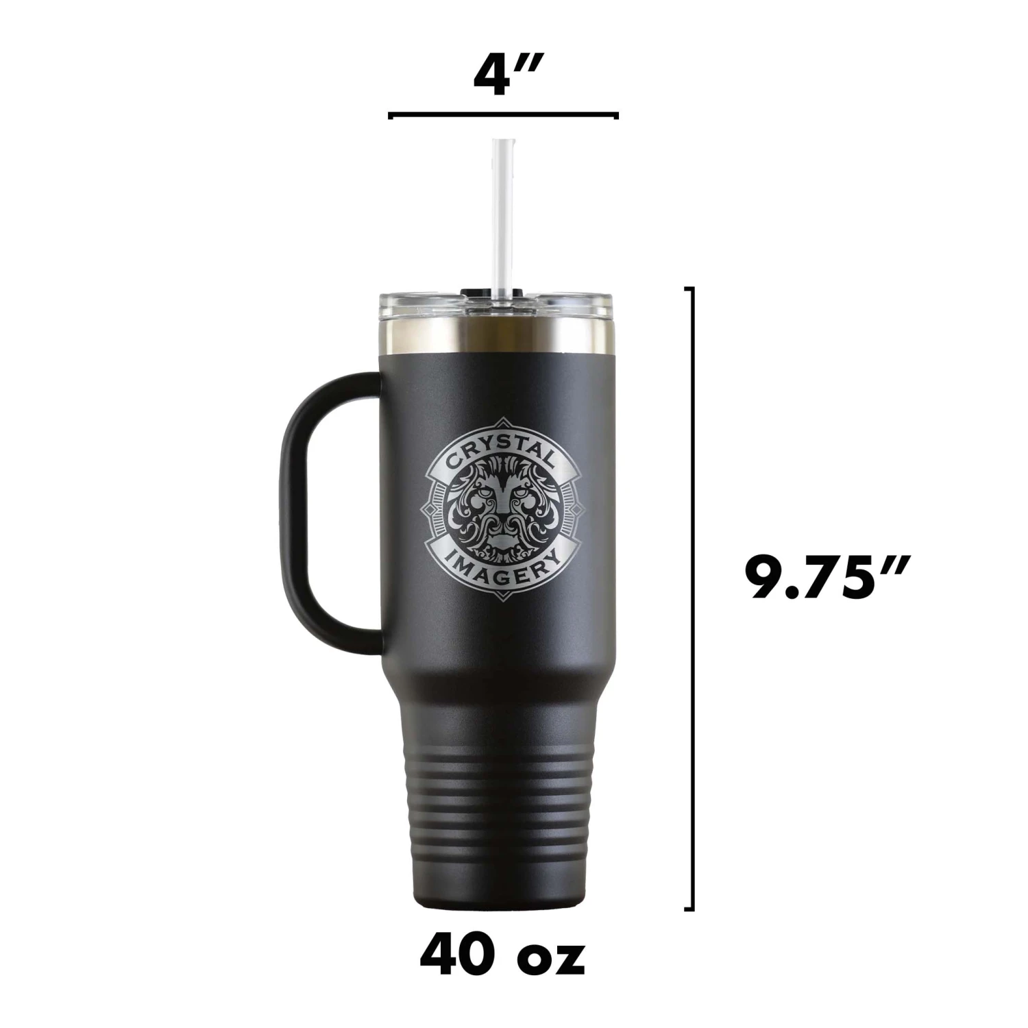 Our stainless steel travel mug with handle is perfect for hot coffee or cold beverages on the run and has a narrower bottom to fit most cup holders in your car, jeep, or truck. The straw is included. We selected these handled Polar Camel 40 oz. vacuum insulated travel mugs for their high quality and durability. We laser etch your unique, funny and clever quotes and designs into the powder coated travel tumbler, which creates the design in a sleek stainless steel finish.