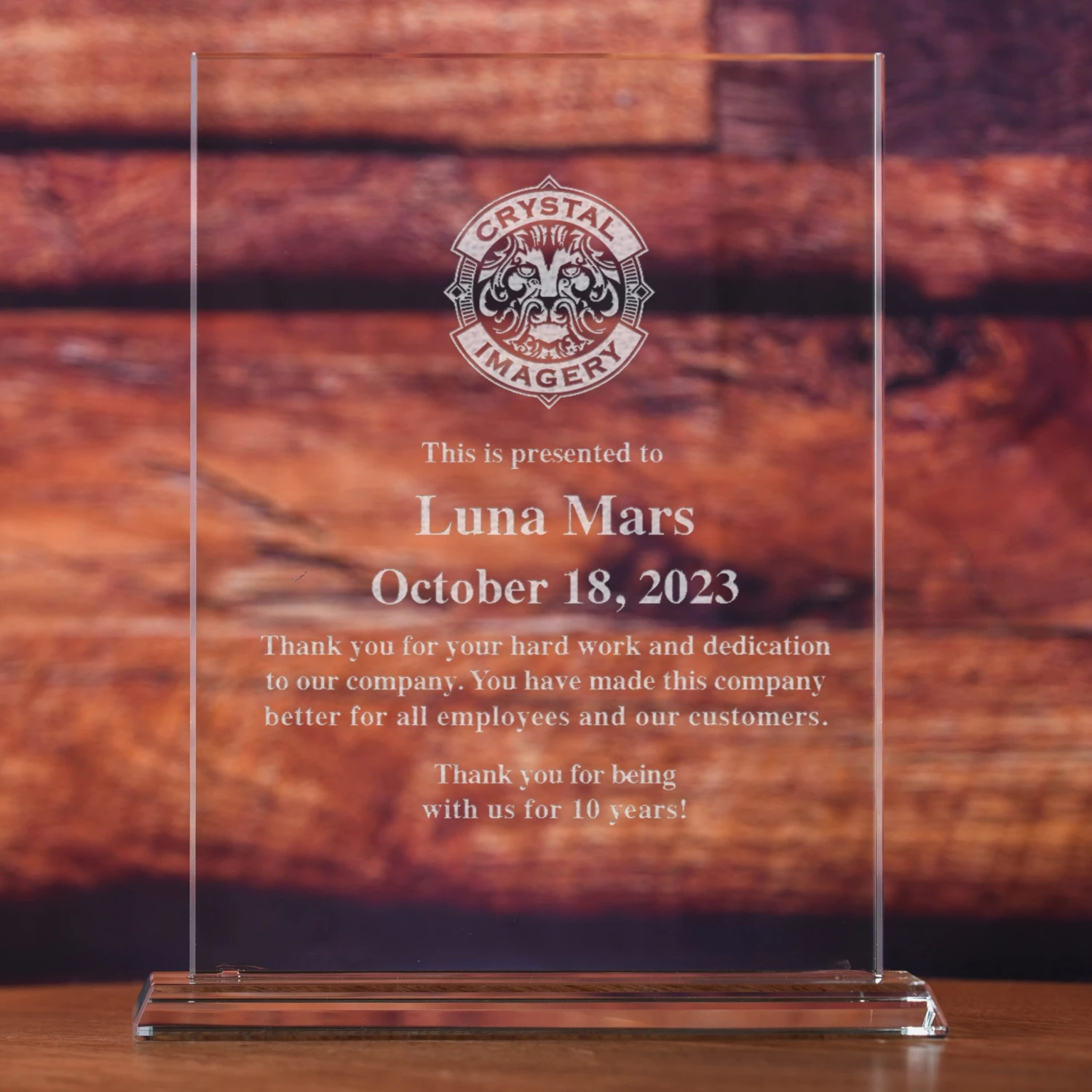 Your own corporate logo or design award is beautifully deep etched into this clear glass desktop award, and is the best award you could give your recipient. This clear glass plaque gives a simple yet direct canvas for plenty of engraving, with a slight blue tint that makes this piece special. This is also a perfect gift for Christmas or holiday events for your employees, special clients, customers and colleagues.